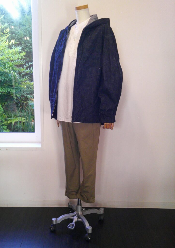 そろそろ朝晩に寒さを感じて羽織るものが気になります。こちらはゴーシュのデニムジャケットですが本格的な寒さになるまで丁度良い素材と思います。今回のゴーシュは秋の始まりのシャツも大きめでしたがこちらもゆったりしたシルエットです。ですから中には長袖のカットソーからまた寒くなってニットを合わせることになっても大丈夫。前はジップアップになっていますしジップのトップが低い位置で終わっているのでハイネックやストールを合わせてもおさまりが良いと思います。