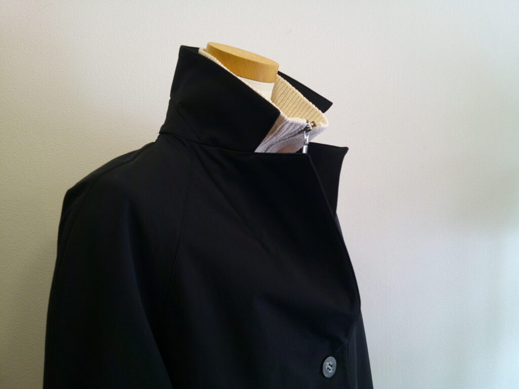 裏衿の返りが甘いかなと思ったのですがそれが襟を立たせたときにしっかりと立ってくれます。その上からストールを巻いてもよく、お天気の変わりやすい春にはありがたい。シンプルなデザインでお色は黒。長く楽しめそうです。