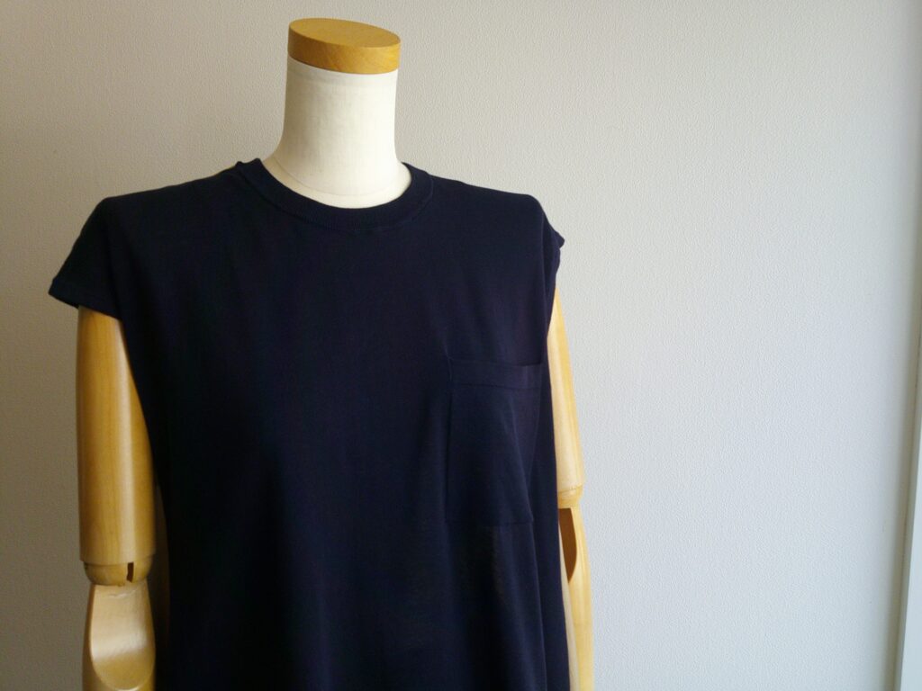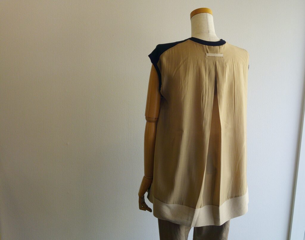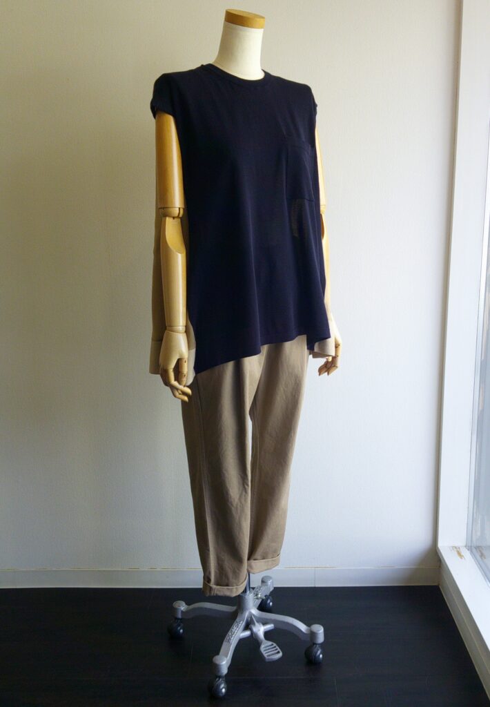 前身頃に薄地のコットンニット、後ろに配色の薄手布帛生地を組み合わせたデザインが楽しく、涼しい着心地のトップ。後ろ丈は長くフレアーが入って身体につかず一枚でも楽しめるのです。肩から胸にかけてはコンパクトなシルエットですのでボトムも案外いろいろと選べるます。ADAWASらしい配色と異素材の組み合わせが着ていて気分が上がります。