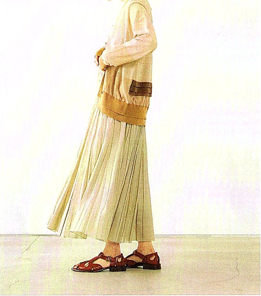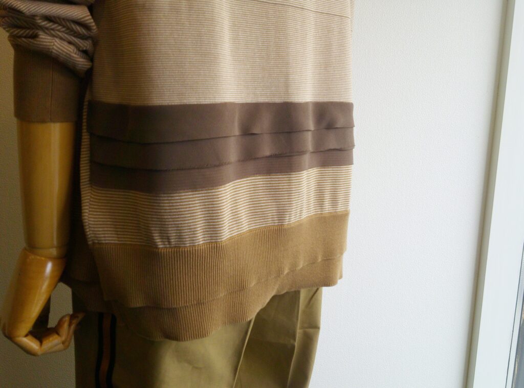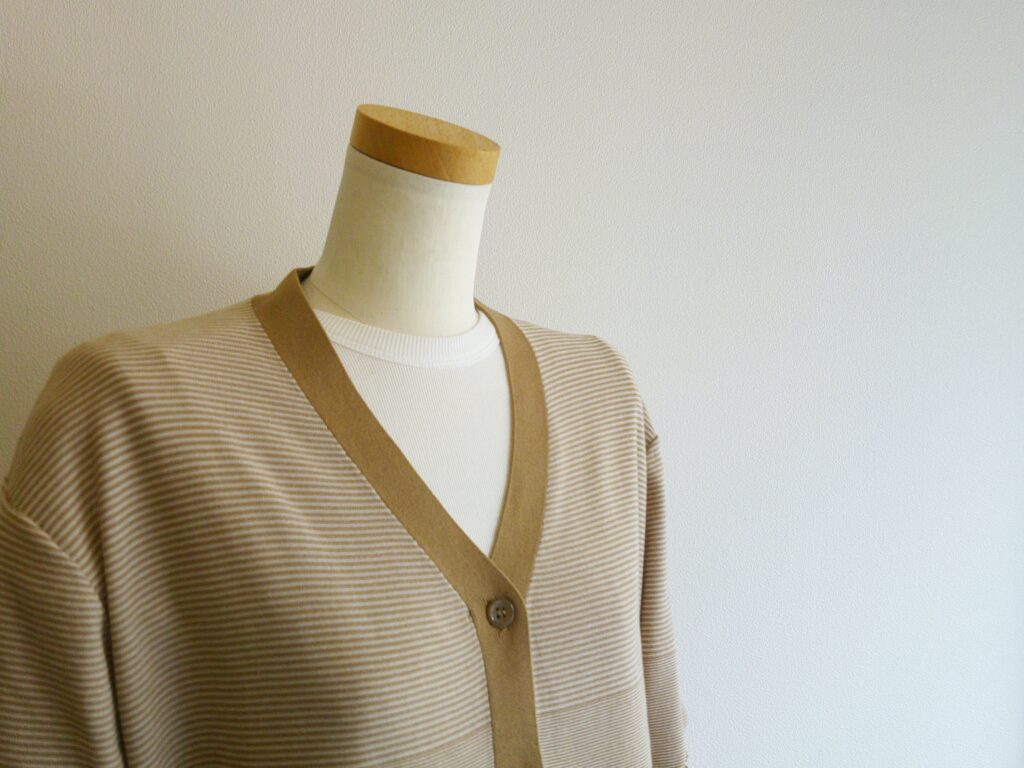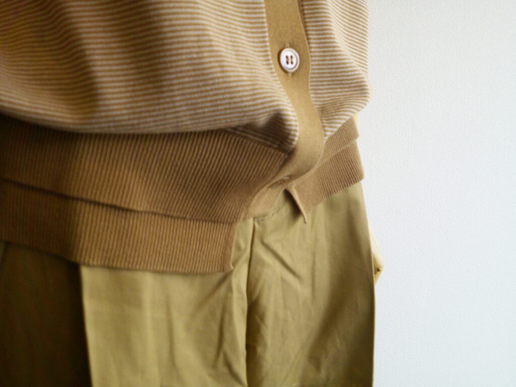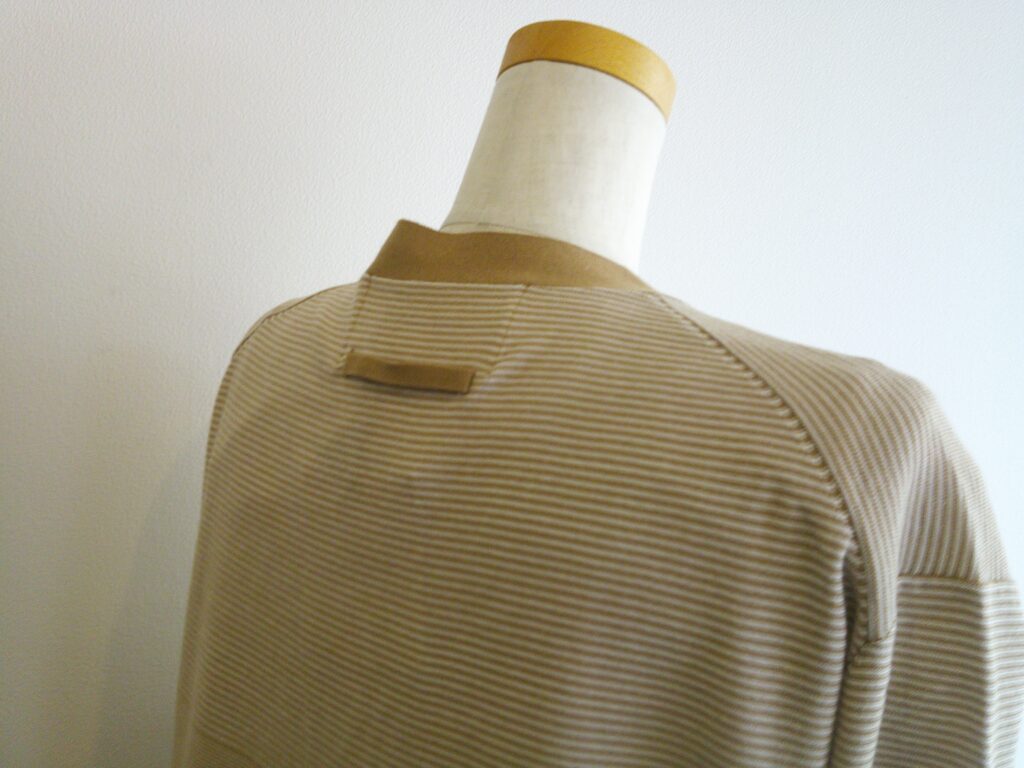 細いコットン糸を使用した薄地のカーディガン。異なるピッチのボーダーは奥行きのある表情をしています。ボーダー好きなPASSOにはたまらない!それに後ろにはシフォンのバイアス生地を重ねフリル状のディティールを加えていてADAWASUらしい、ボーダーでもちょっとフェミニンさも加わってスカートにも合わせたくなります。さらりとした肌触りは春から夏を通して着用出来ると思います。出番が多そうです。