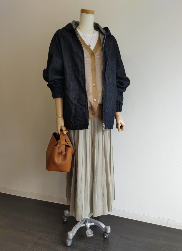 白とキャメルの組み合わせ。アクセサリー感覚で持てるFEEL AND TASTEの小さなバッグで。
