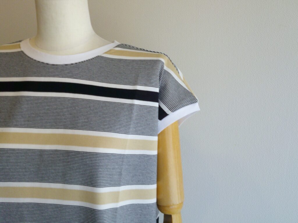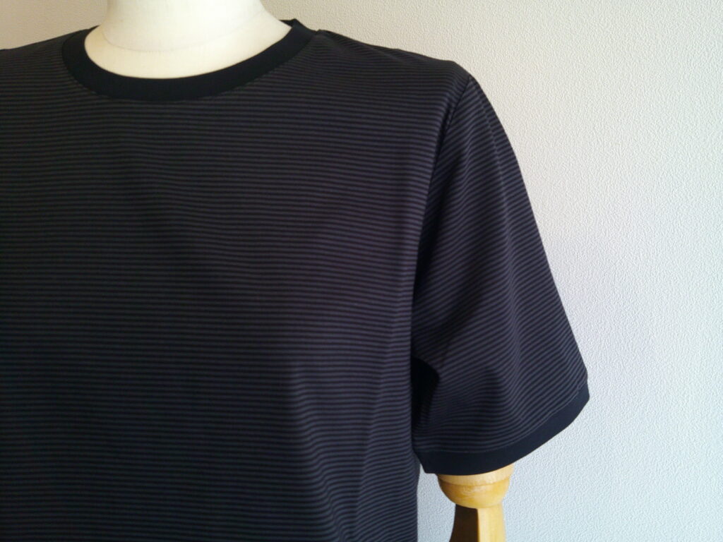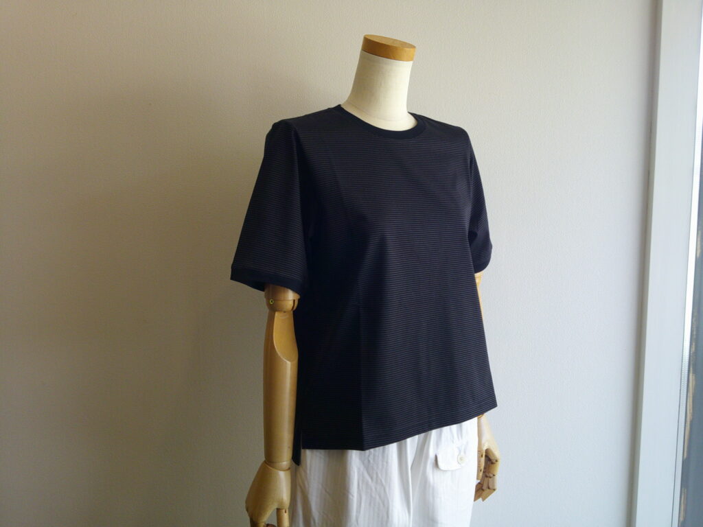 無地感覚で活躍できそうなみじんストライプ。編地の打ち込みも良くツヤのある美し素材です。衿は無地の配色で。着丈に前後差をつけています。オーガニックコットン使用。